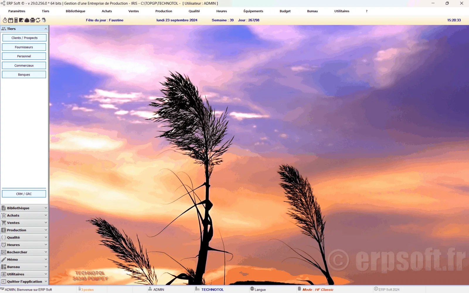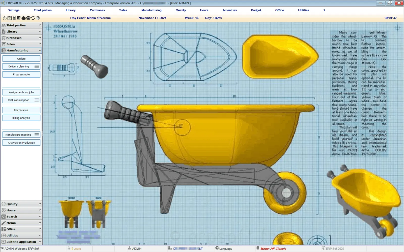 ERP Soft allows you to manage by case, by order or by stock, from technical study to invoicing through production (Sales management, Purchasing, Subcontracting, Stocks, Calculation of Needs, Manufacturing orders, Workshop monitoring, Traceability, Quality document management, accounting interface, Multi-level nomenclatures, Simplified planning, Time and stock recording by Barcodes, data extraction in Excel.)